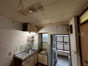 対象はキッチンの天井・壁、木部、そして玄関扉で、全体的に経年劣化や汚れが目立つ状態でした。